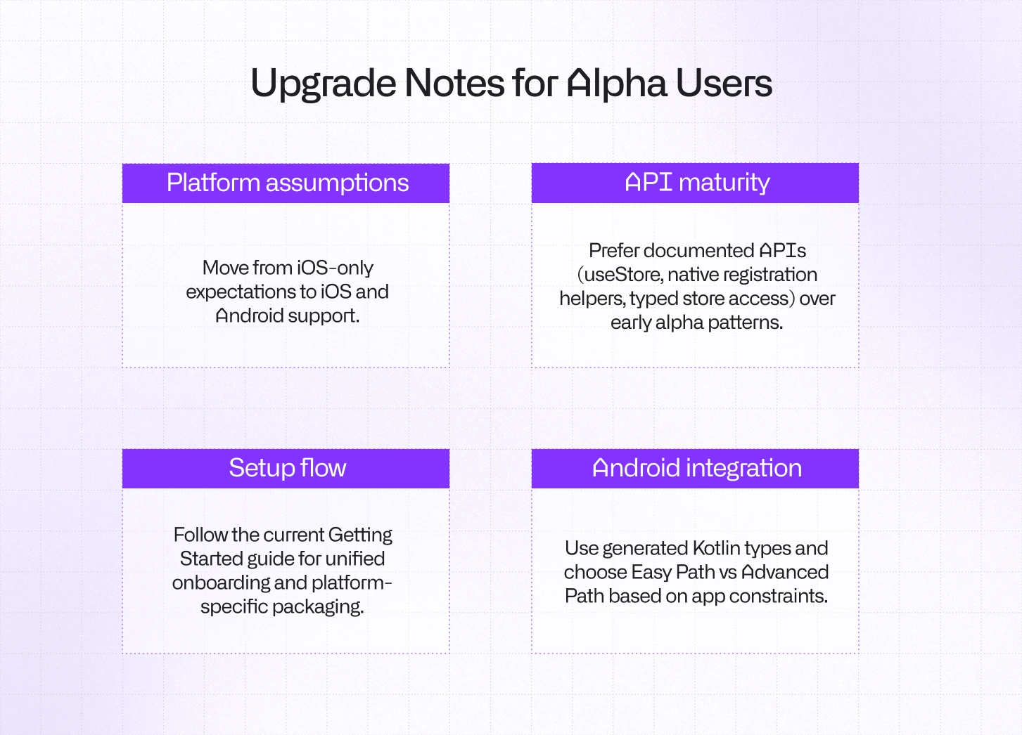 The setup flow is more cohesive now. Rather than stitching together early examples, it’s best to follow the current Getting Started guide, which reflects the unified onboarding and packaging process. The API surface has matured as well. Instead of relying on early patterns, use the documented APIs, useStore, native registration helpers, and typed store access, which are stable and consistent across platforms.