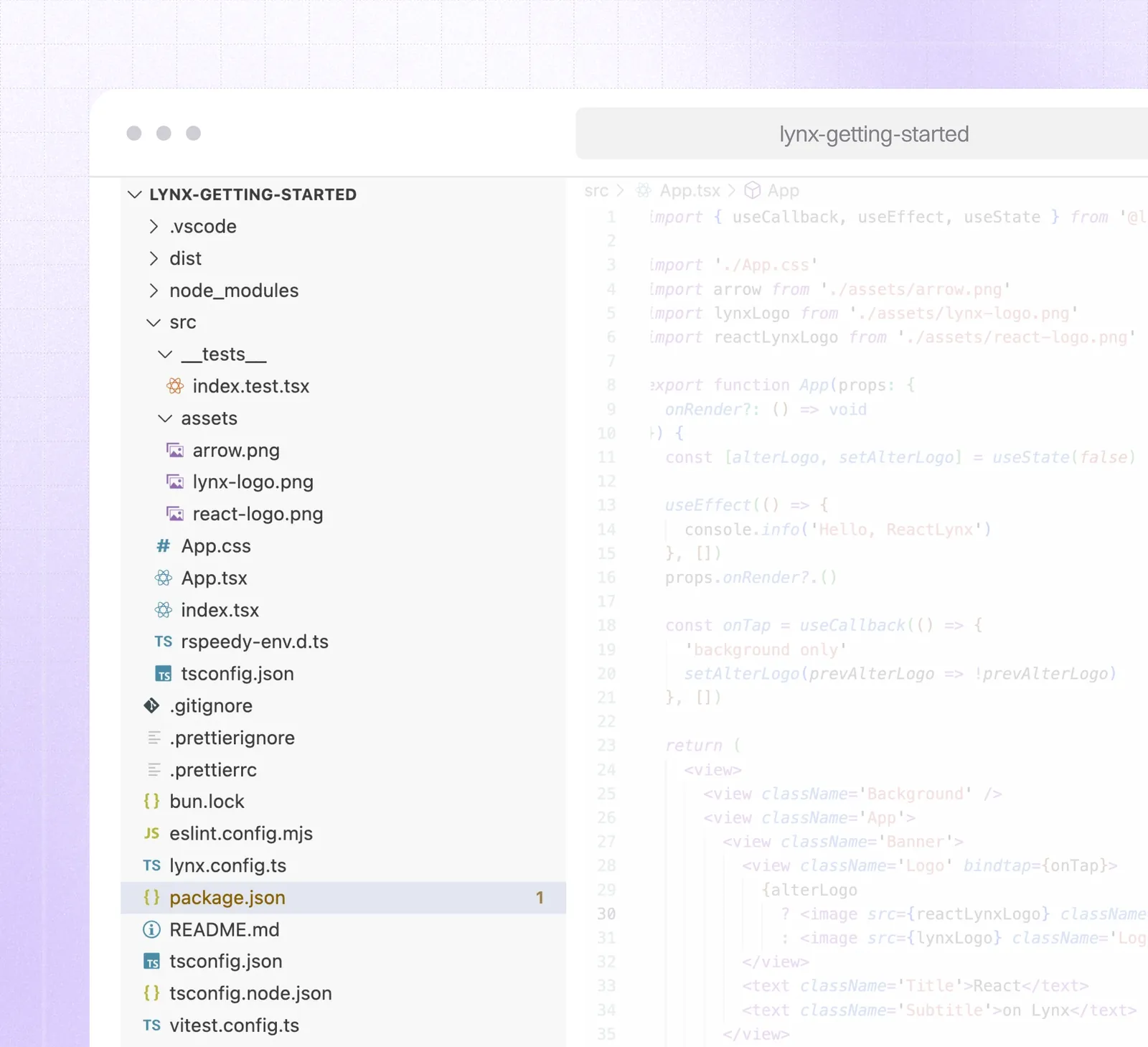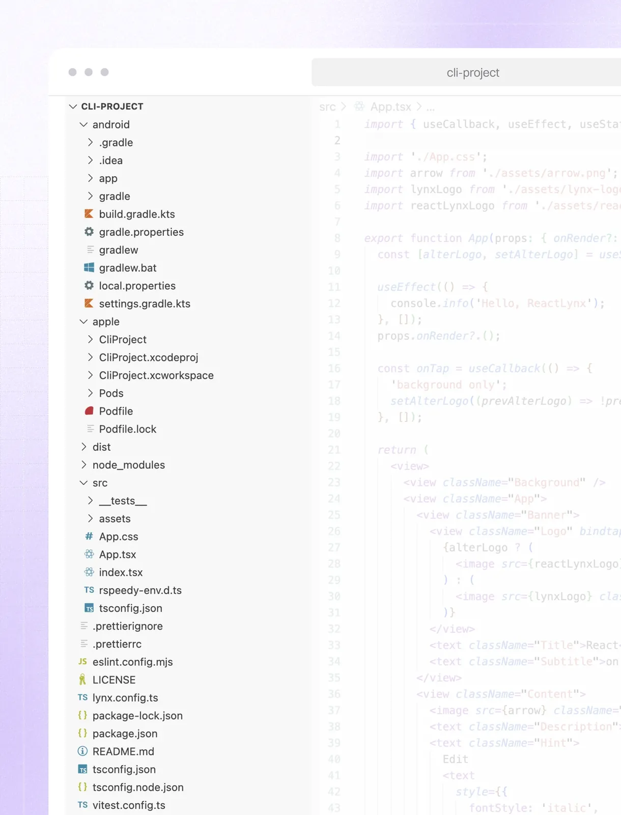 From here, you can edit App.tsx or change the styles in App.css and see updates instantly. It’s the same development experience you get with Lynx Explorer: same hot reloading, files, runtime. The only difference is that you’re running everything inside your own native app, not the shared shell.