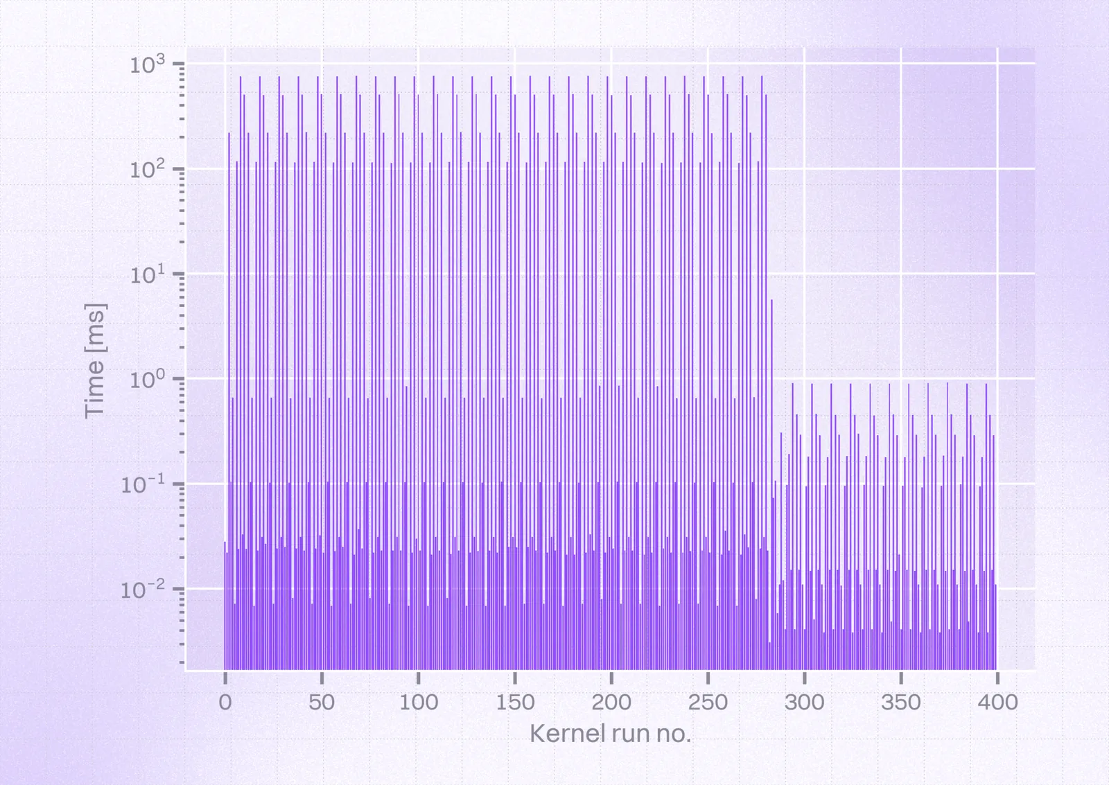 So, we could see a few kernels ($56$ that took over $0.4s$, including $28$ that took over $0.6s$) at the very beginning took $\approx1000ms$ instead of $0.7ms$. Taking a closer look at this time frame, we could obtain the following view: